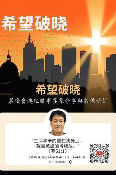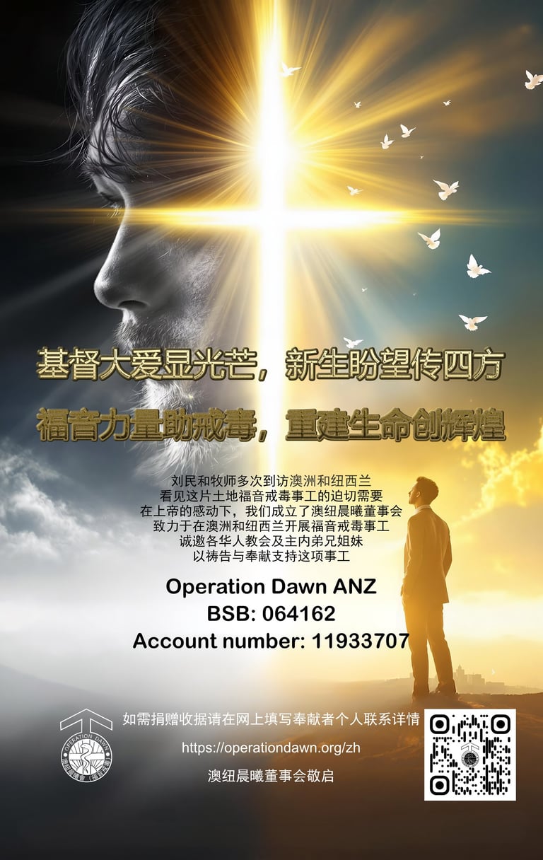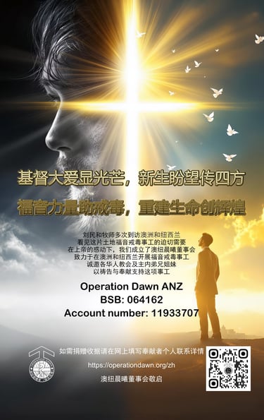 澳紐晨曦會(Operation Dawn ANZ)目前正處於規劃階段,是一個基督教非營利性公益機構,致力於通過靈理治療和福音的變革力量達成戒瘾。 我們滿懷熱忱的志願者團隊將致力於通過基督的恩典和力量説明引導人們徹底達成戒瘾,戒毒。 我們衷心歡迎更多的基督裡的弟兄姐妹加入我們的 WhatsApp 群組,在這裡您可以提出自己的意見和貢獻,我們可以一起為這項美好而崇高的事業傾注我們的愛和力量。